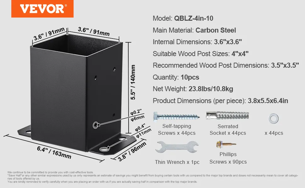 These VEVOR 4x4 post base brackets are designed for secure and effective support. Each post base measures 3.8x5.5x6.4 inches. They are ideal for 3.5x3.5 inch columns. The full wrap structure design ensures no wobbling. This makes them perfect for pergolas, deck handrails, and columns. You can trust them to keep your structures stable and secure. When it comes to peace of mind, knowing your buildings are well-supported is crucial. The compact size of these post base brackets makes installation easy in various locations. So, they're versatile for many outdoor projects. With these brackets, you can build sturdy and reliable structures with ease.