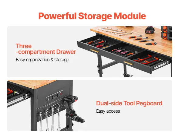 This VEVOR workbench with rollers is designed to keep your workspace flexible, organized, and easy to work in. It can support up to 150 lbs and measures 60 x 24 inches. The four casters move smoothly, with two locks to keep the wheels locked in place. It has five height settings, ranging from 30.7 to 41.7 inches. A wide drawer with three sections and side hooks keeps tools organized and easily accessible. The built-in power strip features four AC outlets, two USB ports, and a 9.8-foot cord, providing power where you need it most. Made with a 1.2-inch oak top and steel frame, this bench is built to last for a long time.
