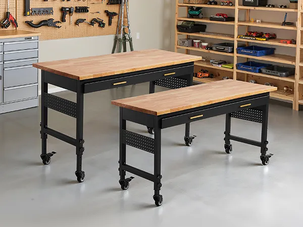 This adjustable-height workbench with wheels can hold up to 1,500 lbs. So, it is perfect for demanding projects. The large 60 x 24-inch surface provides large room for cutting, shaping, and building. You can place heavy equipment, tools, or materials on top without worrying about space or strength.
