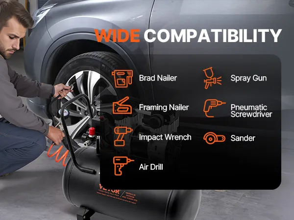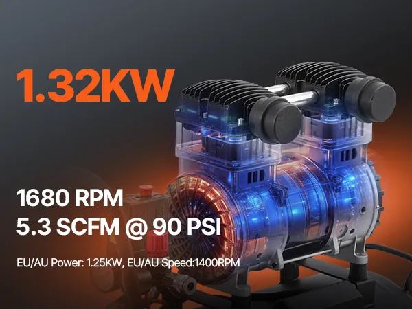 Compresor de aire de 15 galones: Nuestro motor sin aceite de 1,32 kW impulsa el compresor hasta una velocidad de 1680 r/min y un caudal de aire de 5,3 CFM a 90 PSI. Es ideal para diversas herramientas neumáticas, como clavadoras, llaves de impacto, pistolas de pintura, destornilladores neumáticos, inflado de neumáticos, reparaciones de automóviles, pintura con aerosol, clavado de madera, etc. Información sobre el voltaje: Estándar estadounidense de 110 V, estándar europeo de 220 V. Verifique el voltaje de su país antes de comprar.