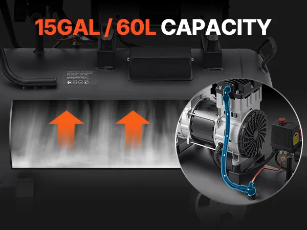 Este compresor de aire horizontal incluye un tanque de aire de gran capacidad (15 galones), que proporciona una amplia reserva de aire. Garantiza un suministro de aire continuo y estable durante sesiones de trabajo largas e intensas.