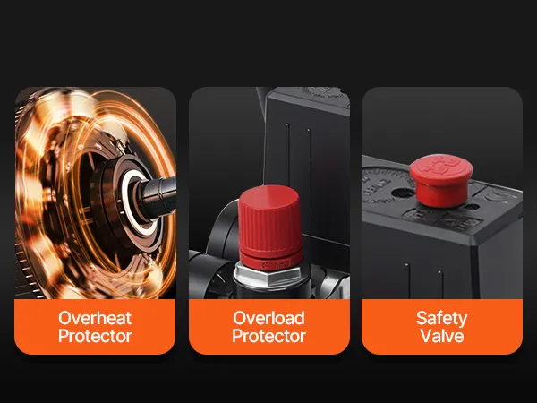 La seguridad es primordial: El tanque del compresor de aire está equipado con un ventilador de refrigeración de gran tamaño y protección automática contra sobrecalentamiento para evitar daños. Además, cuando la presión actual o la presión de almacenamiento son demasiado altas, el compresor se apagará automáticamente o activará un sistema de alivio de presión.