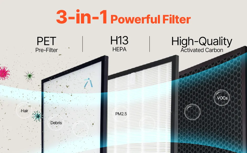 Triple H13-Grade Powerful Filtration: The three-layer filter system delivers wonderful purification. The pre-filter layer blocks hair and dust, the HEPA layer captures fine particles, and the activated carbon layer absorbs odors and harmful gases. This creates fresh air in every room, bringing you an unprecedented clean air experience.
