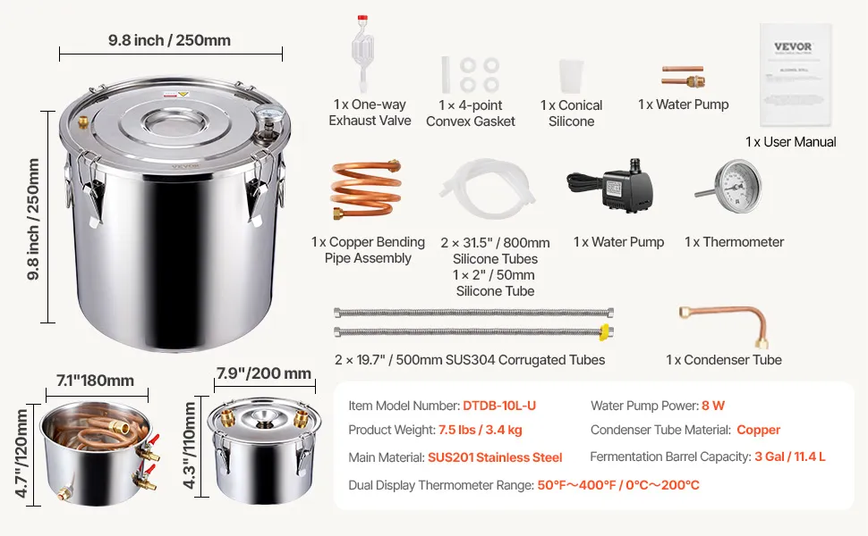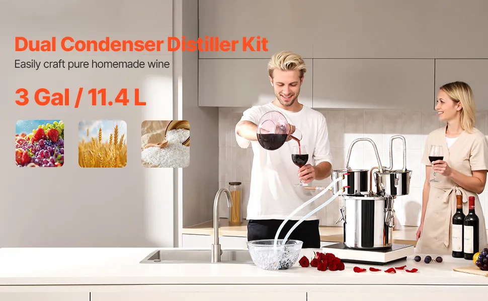 3Gal Dual Condenser Distiller Kit: We offer a complete kit for this flavor-enhancing distiller, ideal for brewing fruit wines, whiskies, brandies, champagnes, vodkas, water, ethanol, and other distilled products at home. The main components include a fermentation barrel, barrel lid, cooling pot, and thumper keg. The fermentation barrel comes in multiple sizes: 3Gal, 5Gal, 8Gal, 13.2Gal, catering perfectly to family gatherings or parties with friends.