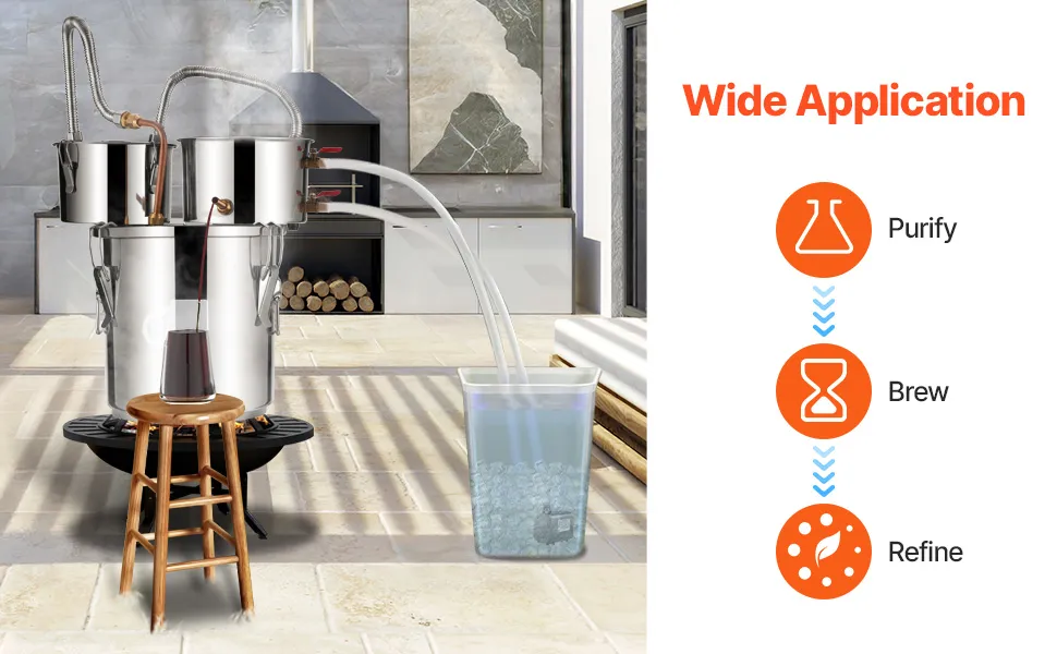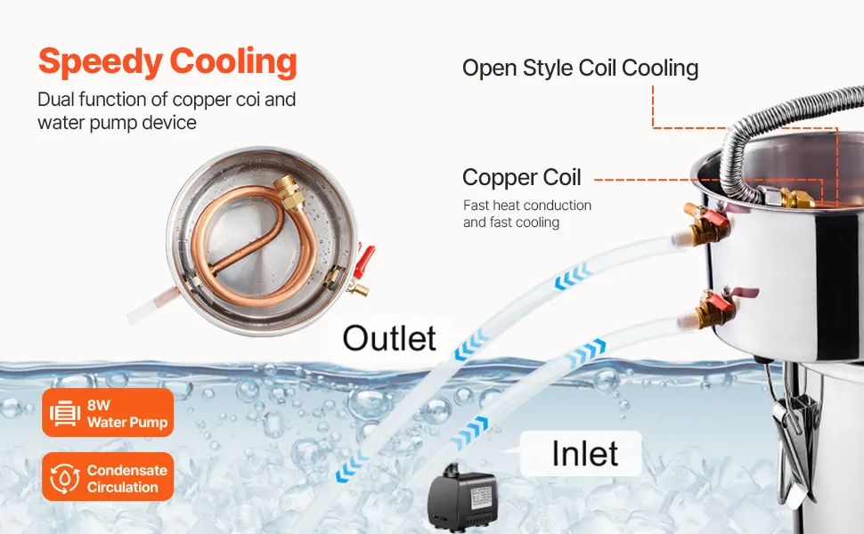 Quick and Efficient Cooling: The cooling and distillation process uses copper tube with good thermal conductivity to accelerate cooling. The smooth and wrinkle-free interior of the pipes prevents residues of distilled alcohol and water, ensuring no aftertaste. A water pump facilitates cooling water circulation for thorough and efficient cooling.