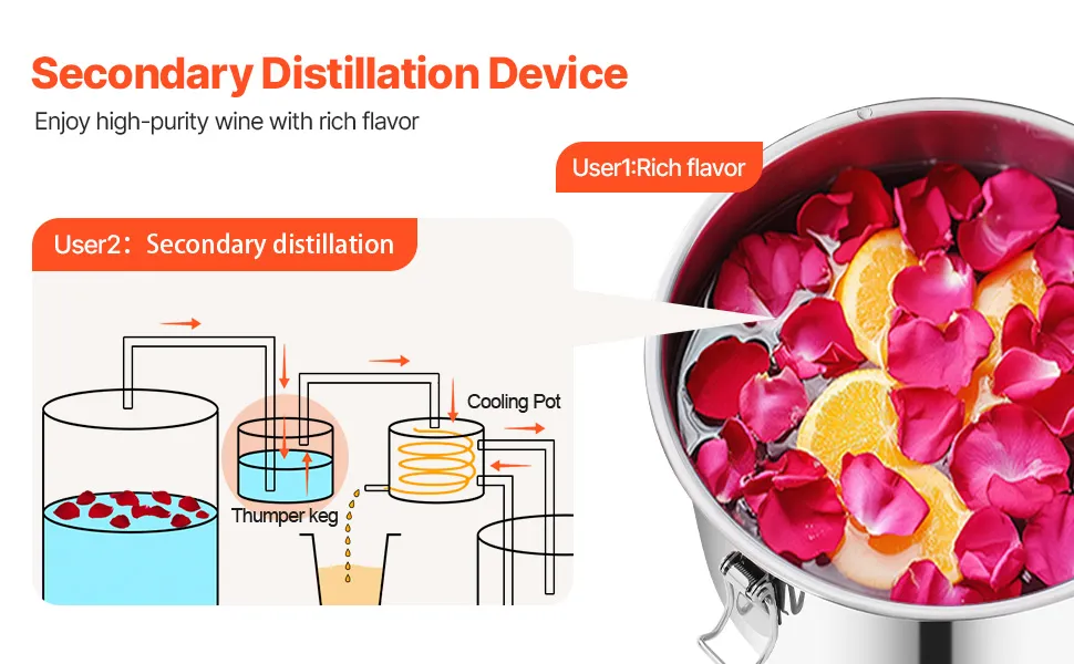 Secondary Distillation System: A thumper keg is added in front of the cooling pot, delivering purer and richer flavors. The thumper keg is used for secondary distillation to produce whiskey or other spirits with higher purity. You can also add various flavoring ingredients to enhance the complexity of the finished wine.
