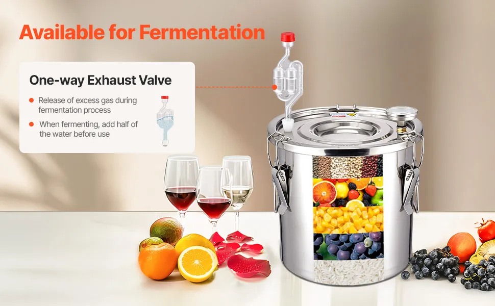 Secure Fermentation and Heating: The fermentation barrel is convenient to use. A unidirectional exhaust valve releases gases produced during fermentation, reducing internal pressure. The thickened stainless steel bottom is compatible with various heating methods such as wood fire, gas stoves, and gas stoves, preventing deformation and damage. The temperature gauge on the lid displays Celsius and Fahrenheit temperatures, facilitating temperature monitoring during distillation.