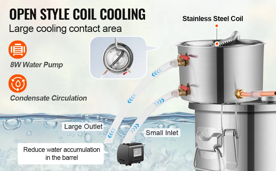 Cooling with Water Pump: The cooling barrel features an open coil cooling system with stainless steel corrugated coils, ensuring durability and effective condensation of steam. Combined with a water pump, it facilitates cooling water circulation, enhancing efficiency and saving cooling water. It's recommended to place cold water and plenty of ice in a large capacity bucket for faster cooling rates and to avoid frequent water changes.
