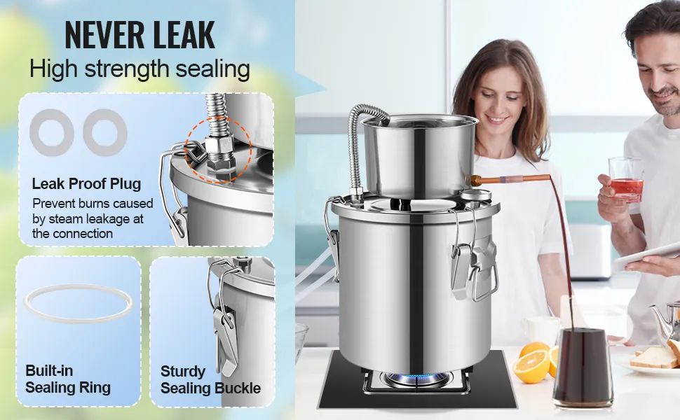 This distiller features reinforced sealing at all closed interfaces and barrel lids, reducing steam loss and preventing leaks.