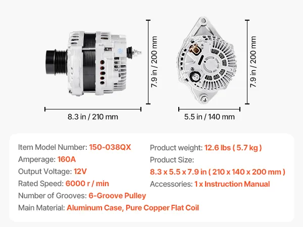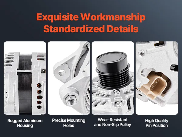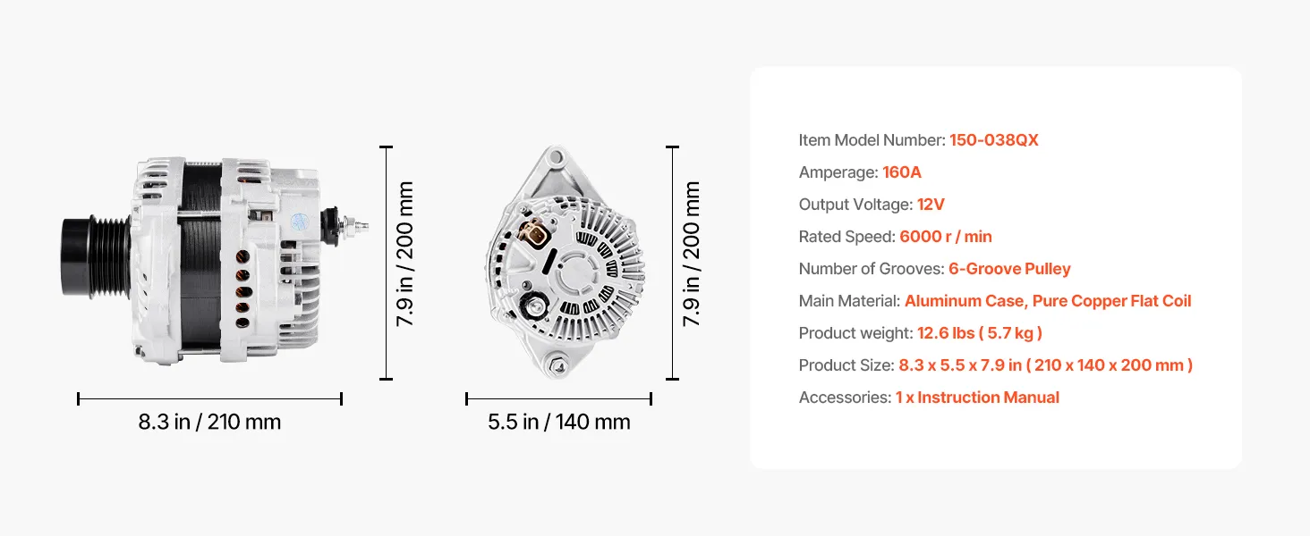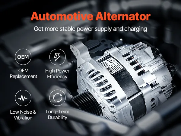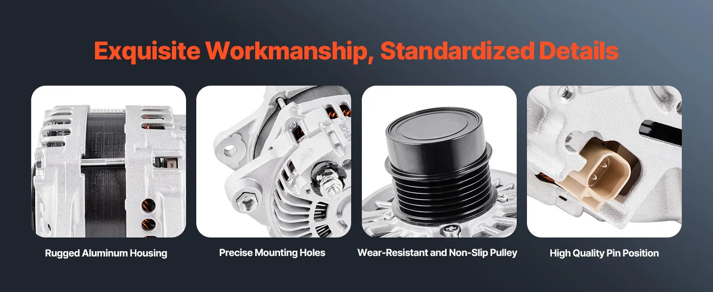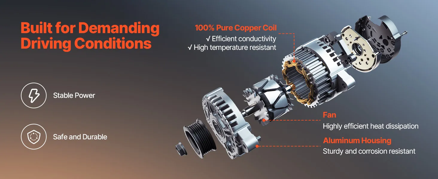 Our alternator replacement features pure copper coils for better durability than aluminum. The aluminum housing and cooling fan boost heat dissipation. It delivers a stable 130A output to support high-load devices like AC and premium sound systems.