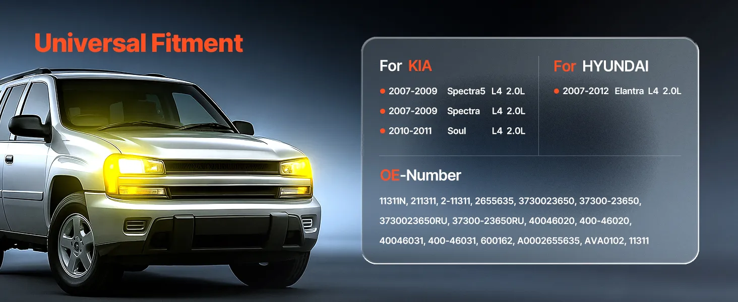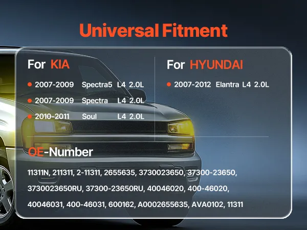 Vehicle Compatibility: Our alternator works great on sedans and SUVs. It fits KIA 2007-2009 Spectra5 L4 2.0L, 2007-2009 Spectra L4 2.0L, 2010-2011 Soul L4 2.0L, and HYUNDAI 2007-2012 Elantra L4 2.0L