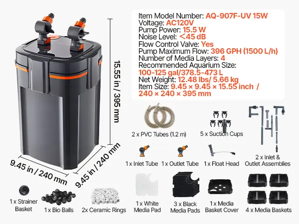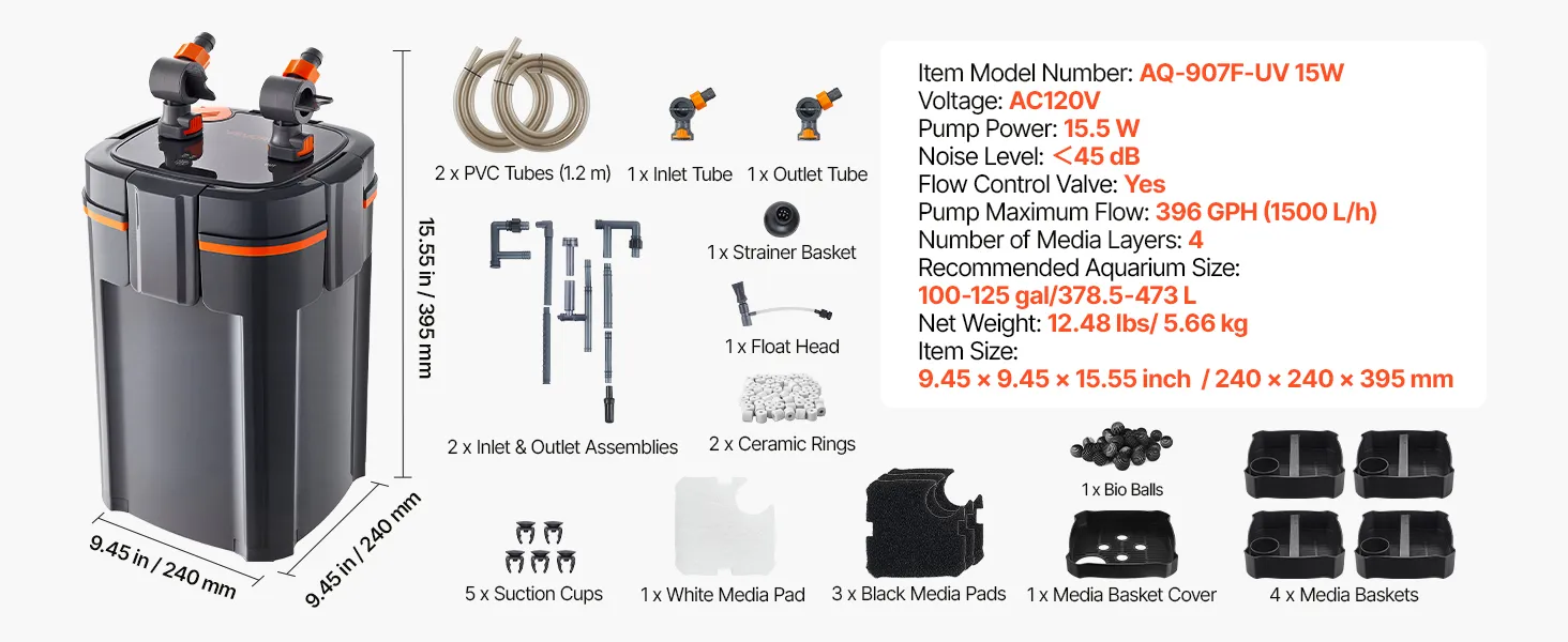 Powerful Water Purification: The canister filter fits 100-125 gal aquariums. Its 396 GPH water pump (15.5W) circulates water for clarity. Post-connection, flow may drop slightly due to pipe height and consumables, but filtration remains unaffected