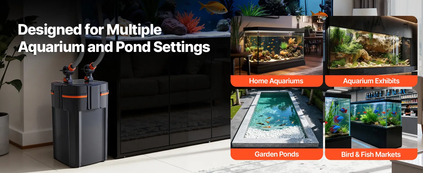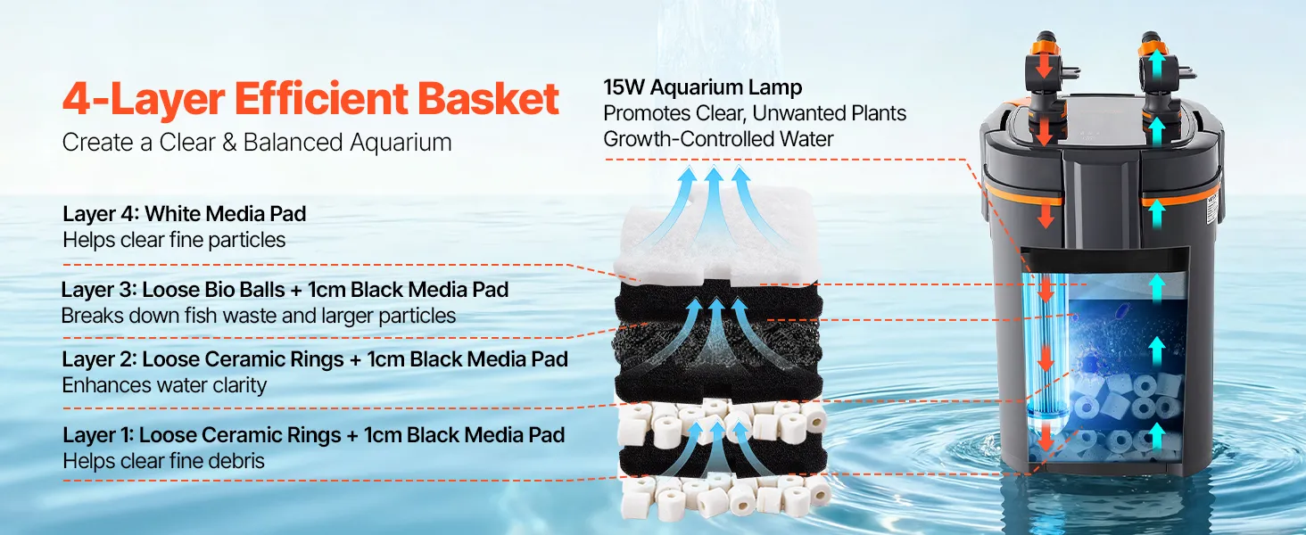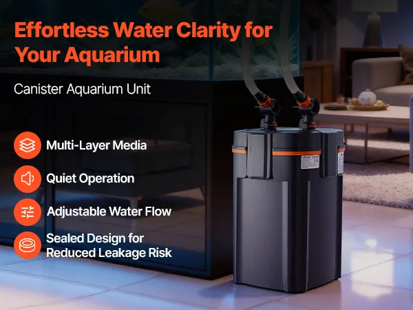 I need a low profile canister for my 24g aquarium and this unit from Vevor was the only one that would fit inside the aquarium stand cabinet. It's been running now for a few months without a hiccup. The water is super clear!