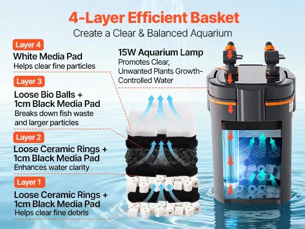 Efficient Filtration: Our aquarium canister filter features a multi-layer filter media, capturing various impurities to ensure clear water quality from coarse to fine layers. With a 9W clean lamp, it cleans weeds under the water and controls their growth
