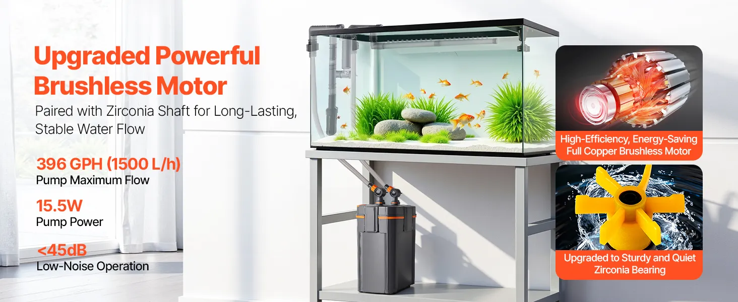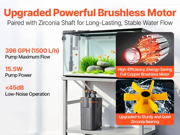 Quiet Operation: Featuring a full-copper brushless motor with a zirconia shaft, our fish tank filter aquarium runs smoothly under 45 dB. Even at night, it will not disturb you and your family while maintaining excellent water purification effects