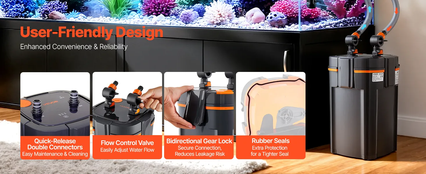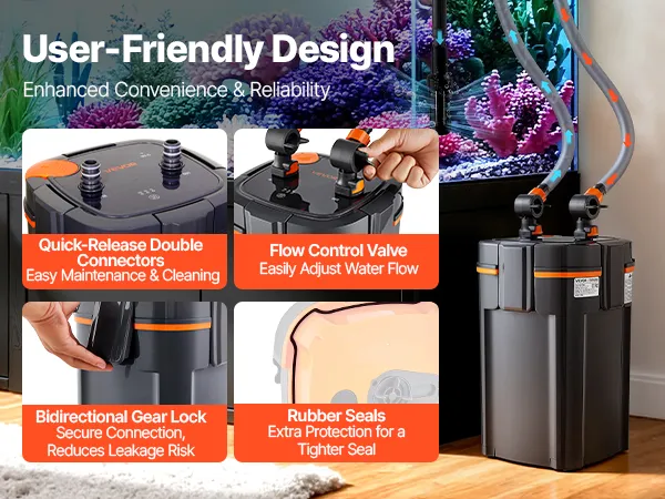 Coming with a flow control valve, our canister aquarium filter easily adjusts water flow. Its quick-detachable double connectors are convenient for maintenance and cleaning. The bidirectional gear lock with a rubber seal ensures a secure connection and avoids water leakage.
