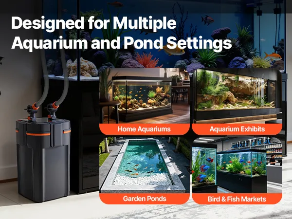 This fish tank filter is suited for home aquariums,aquarium exhibits, garden ponds, and bird & fish markets. It meets water purification needs in different conditions and provides a clear water condition for various aquatic organisms.