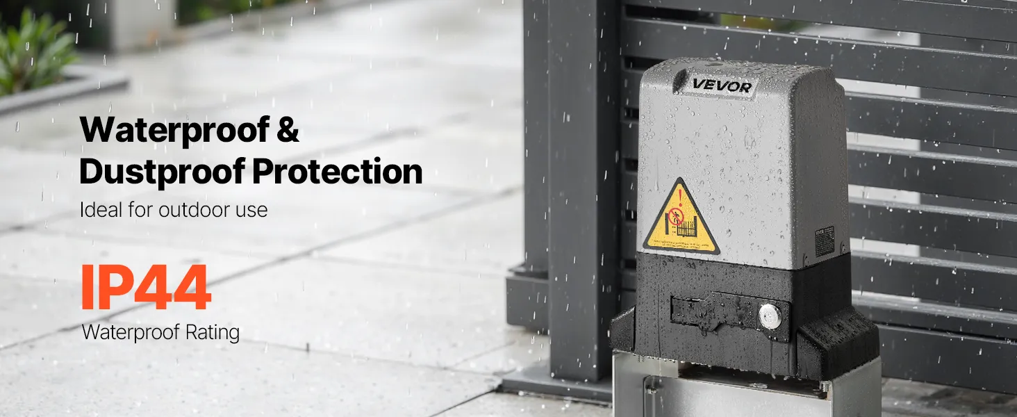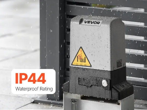 Its IP44 rating means the motor and electronic components are protected from water splashes. It ensures the gate can operate safely in storms and heavy rain.