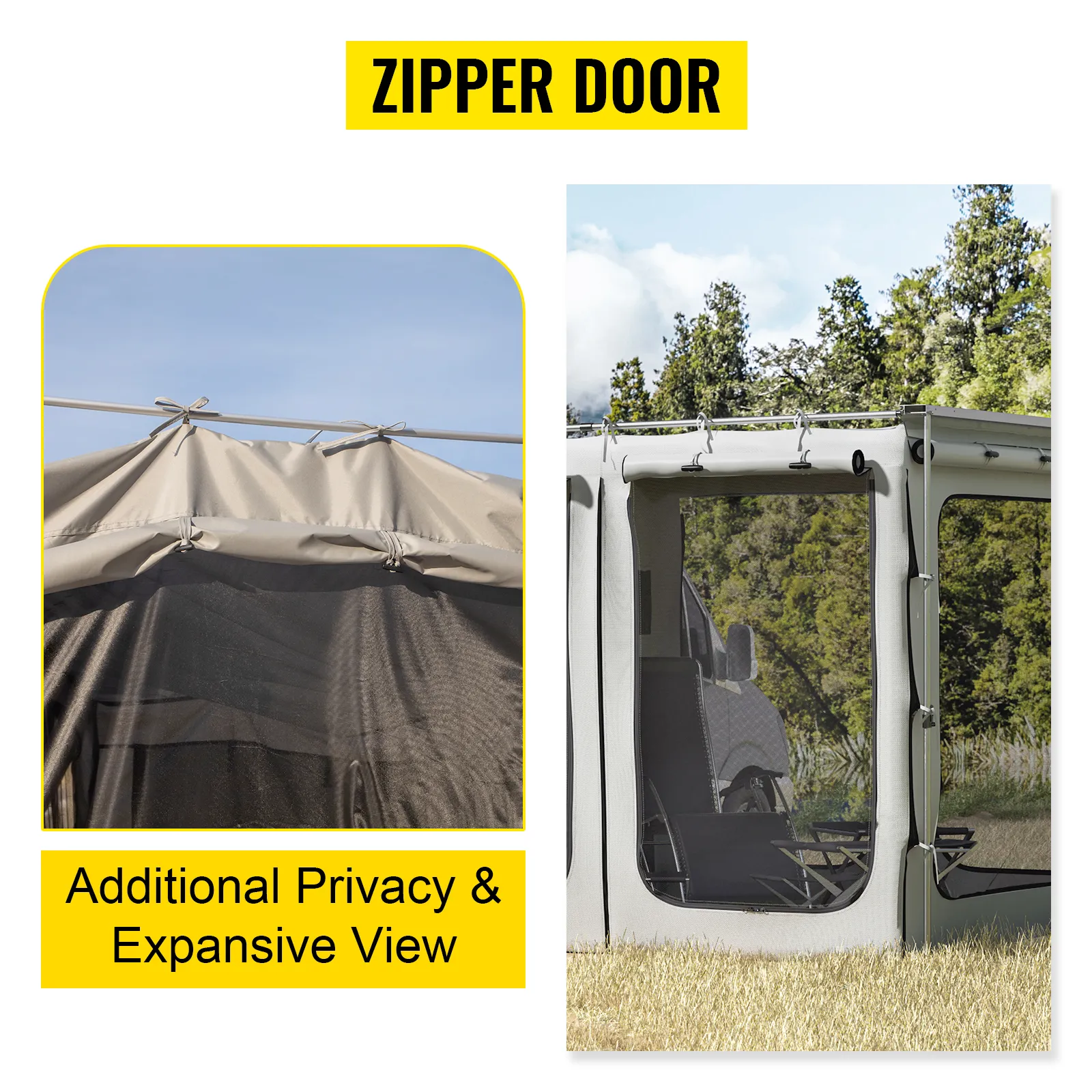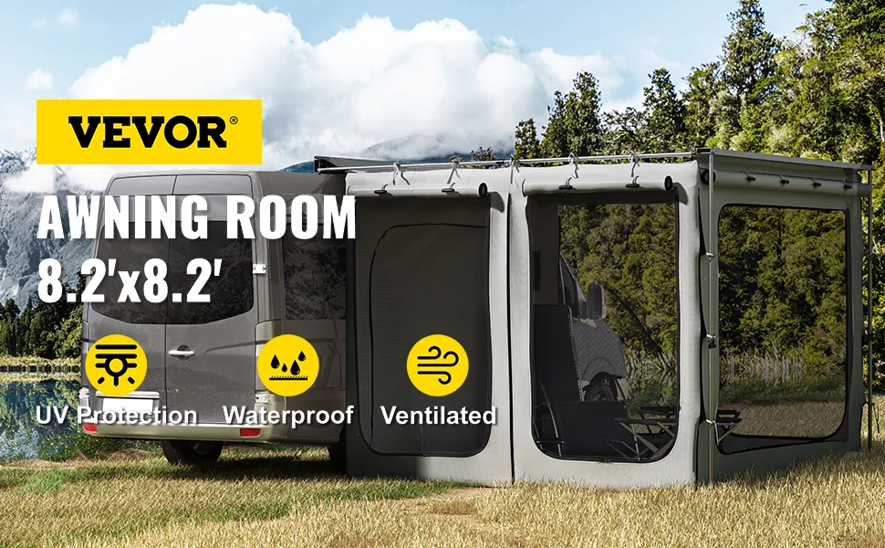 Vehicle Awning Size: 8.2ft (attached to car side) x 8.2ft (extends from car), with the bottom floor. This awning room is only compatible with VEVOR 8.2' x 8.2'/2.5x2.5 m models. AWNING IS NOT INCLUDED BUT NECESSARY.