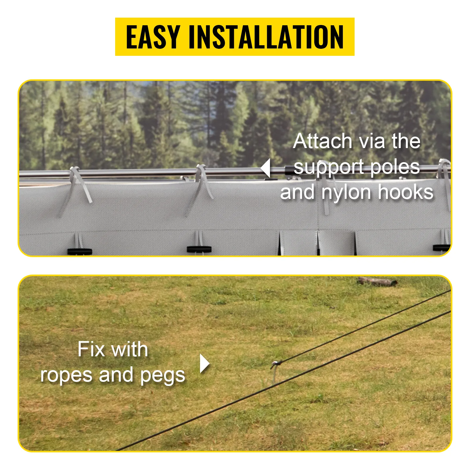 Complete Accessories: The package includes 1 x 8.2' x 8.2' side wall room for awning, 2 x guy ropes, 6 x pegs, 1 x nylon carry bag, and internal mesh pocket organizers. The awning room could easily attach to awning poles via heavy-duty nylon hooks in minutes. Everything you need is well-prepared, so you can start planning your first destination with our vehicle awning room.
