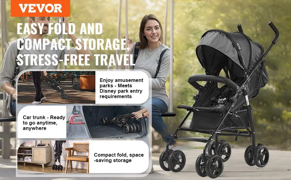 This portable stroller features a foldable design, compact when folded, meeting Disney park entry requirements and fitting easily into your car's trunk. It's also simple to store at home.