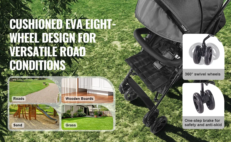Equipped with eight EVA shock-absorbing tires, this travel stroller handles various terrains with ease. The 360° swivel wheels make pushing effortless, and the foot-operated brake stops instantly to prevent rolling, allowing smooth travel on any surface.
