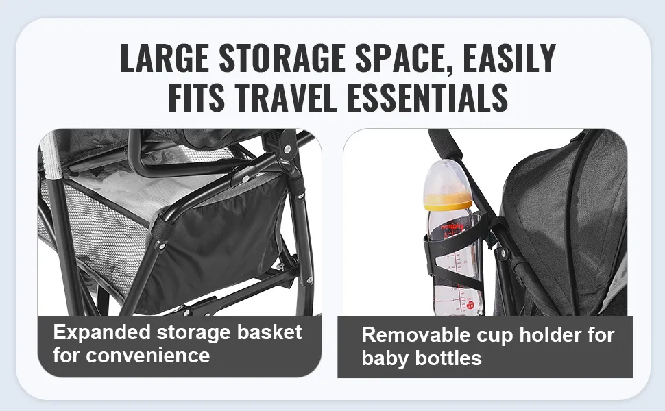 The lightweight baby stroller features a large storage basket underneath and a detachable cup holder next to the handle. It easily accommodates both baby and parent essentials.
