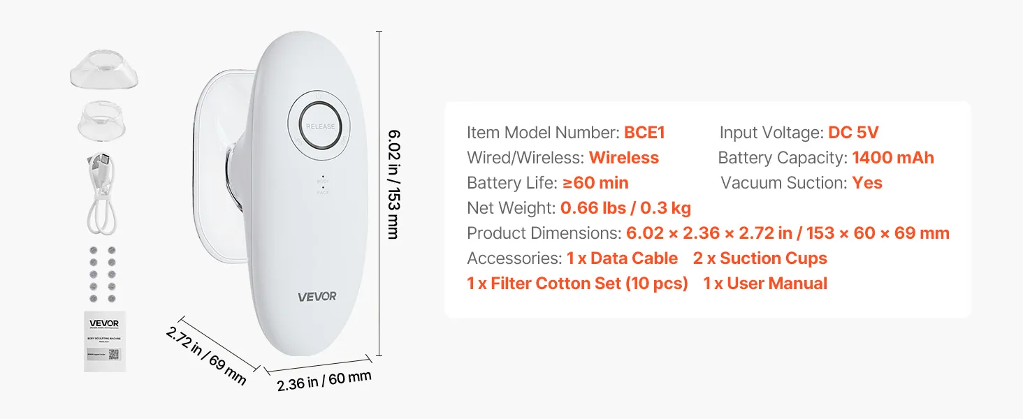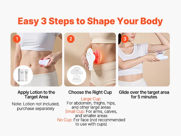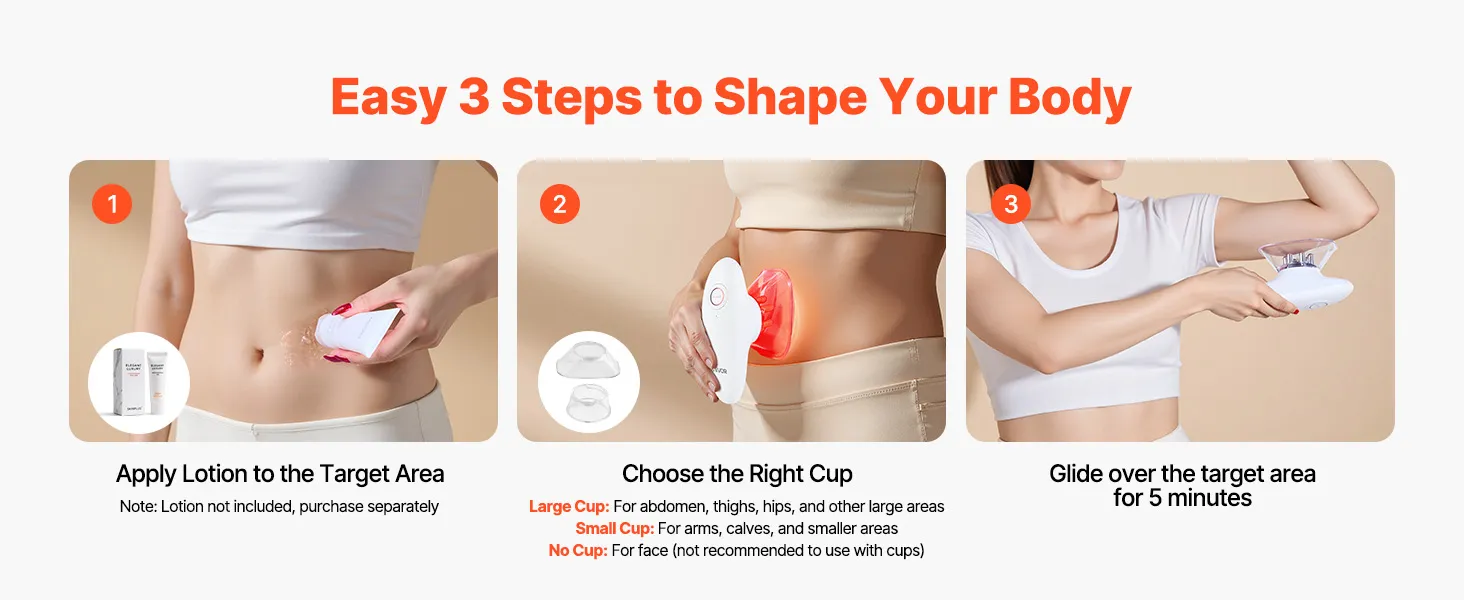 This skin tightening device shapes your body quickly in three steps. First, apply the lotion to the target area. Second, choose the right cup. Finally, glide the device over the area for 5 minutes. Easy to get started.