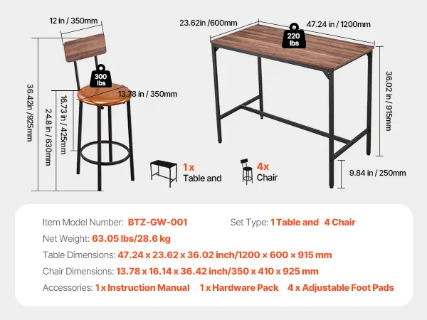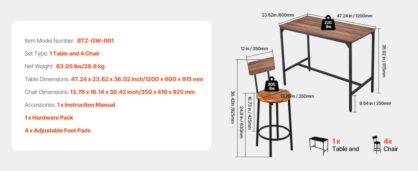5-Pc Table & Chair Set: Our rectangular pub table with stool includes 1 table (47.24 x 23.62 x 36.02 in/1200 x 600 x 915 mm) and 4 backed chairs (13.78 x 16.14 x 36.42 in/350 x 410 x 925 mm) for groups. Its ideal height provides a more relaxed experience