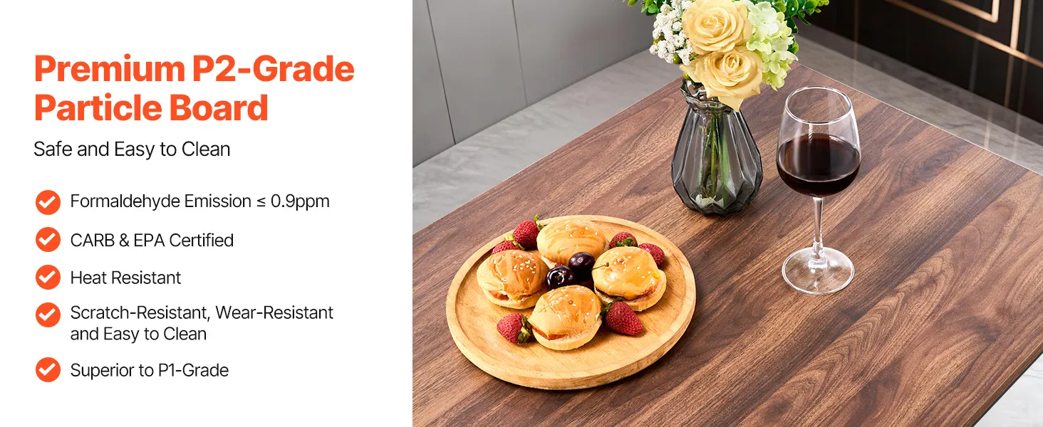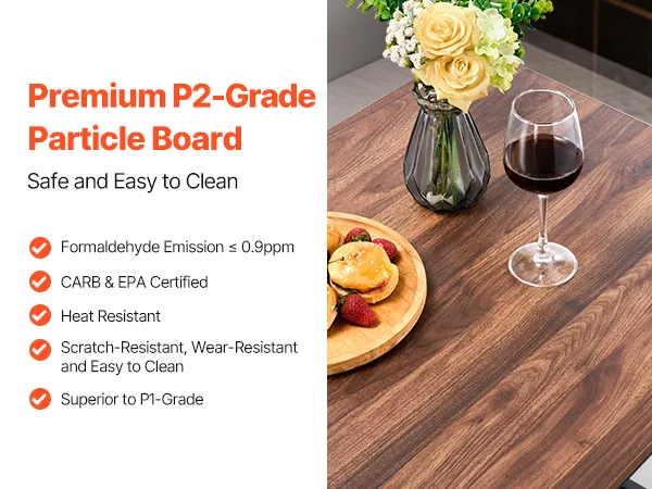 Strict Material Control: The kitchen table and bar stool top is made of P2-grade particleboard certified by CARB and EPA, with formaldehyde emissions kept at ≤ 0.9 ppm. It surpasses P1-grade standards, providing a reliable home condition for you