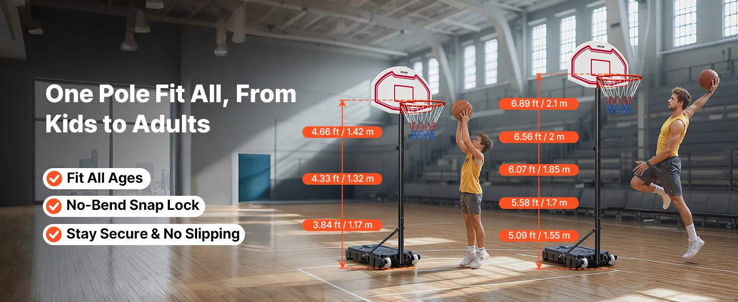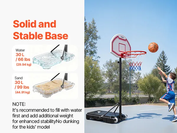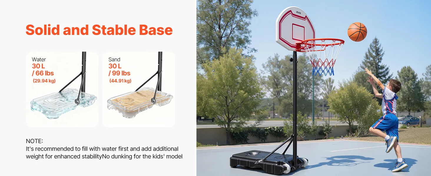Solid Frame: This adjustable basketball goal system features a high-strength square steel frame with PE backboard support for exceptional stability and impact resistance. The thick base can be filled with water or sand, keeping the hoop steady even during intense play and family fun