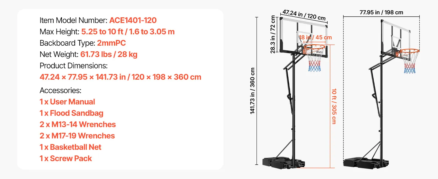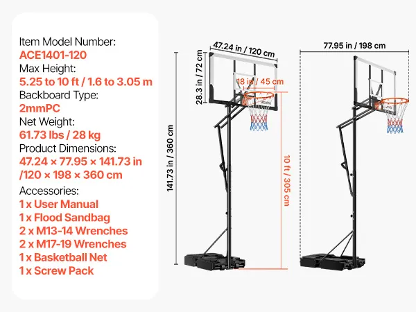 Measuring 47.24 x 77.95 x 141.73 inch/1200 x 1980 x 3600mm, this portable basketball hoop outdoor is perfect for home training. It offers consistent performance, giving children and adults confidence during play while turning your backyard or indoor space into an active basketball area.
