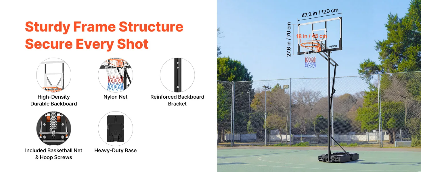 Weather-Resistant Material: Designed with a 48 inch/1219.2mm, 0.08 inch/2mm thick PC backboard with an iron frame and four corner protectors, this kids adjustable basketball hoop delivers accurate rebounds and clear vision. The premium woven net withstands outdoor conditions, supporting reliable performance for backyard or home training sessions