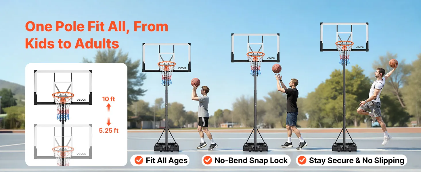 VEVOR Portable Basketball Stand, 5.25 to 10 ft Height Adjustment Basketball Hoop & Goal, Portable Basketballs Hoop with 48 inch PC Backboard & Wheels for Kids, Teens, Adults in Driveways, Pools