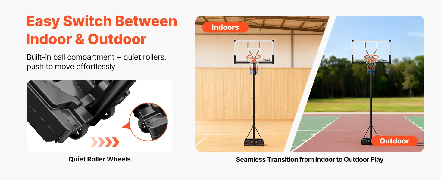 Flexible Wheels: Featuring dual-brake swivel wheels, our outdoor basketball hoop allows full 360° rotation. Move it with ease to any spot, then fix in place for solid gameplay. One person can handle relocation, enabling fast, versatile indoor and outdoor basketball enjoyment
