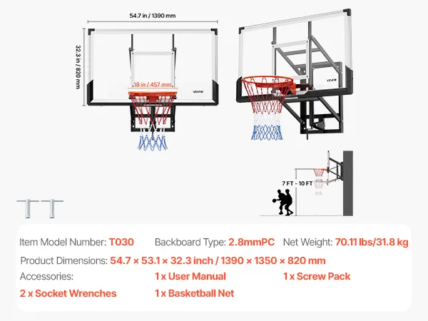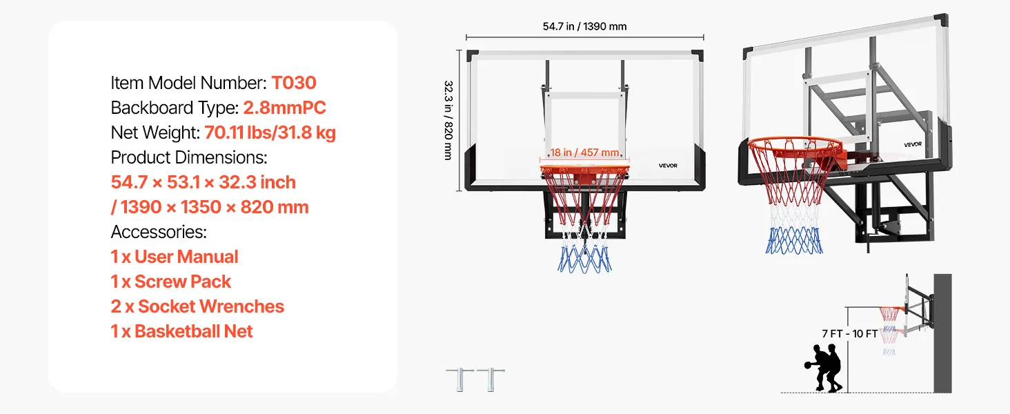 High-Quality Game Board: With a 54-inch/1371.6mm 0.11 inch/2.8mm thick PC backboard, this basketball hoop outdoor wall mount offers precise rebounds and unobstructed views. Suitable for backyard or amateur games, it enhances training results and delivers lasting performance for consistent family play