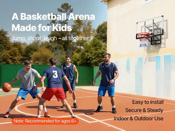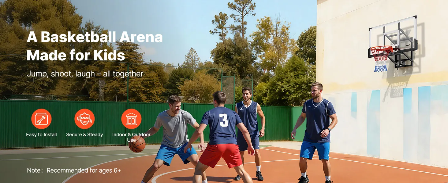 Our wall mount basketball hoop brings pro-level play home. Reinforced steel and PE backboard handle every impact. Clear backboard enhance shooting accuracy, and the durable net stands up to all weather. Includes a sandbag (sand not included) for extra stability. Designed for kids 6+.
