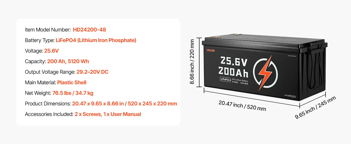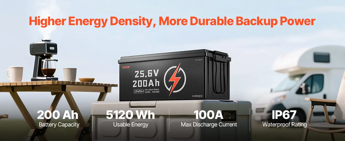 Get reliable, long-lasting energy with the VEVOR lithium battery. It offers higher energy density and reliable performance. It’s perfect for building a strong solar or backup energy system. It protects against overcharging, over-discharging, and overcurrent. The long-lasting deep-cycle battery is much lighter than traditional lead-acid batteries. Its compact design makes it easy to carry anywhere.
