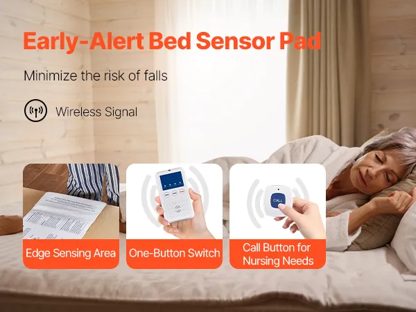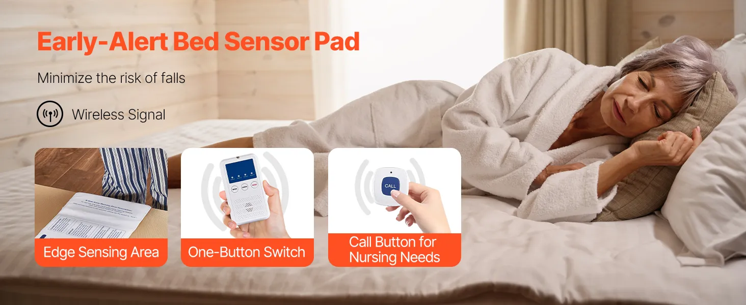 Sistema de alarma de cama VEVOR Early Alert, sensor inalámbrico con botón de llamada y buscapersonas, alarmas de seguridad y prevención de caídas para personas mayores, pacientes con demencia y adultos (25,4 x 89,4 cm)
