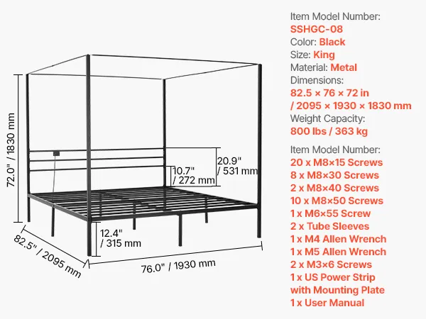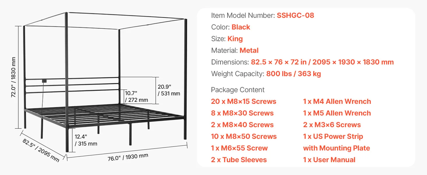 Convenient Storage Space: The canopy bed frame measures 82.5 x 76 x 72 in / 2095 x 1930 x 1830 mm, with a 12.4 in clearance under the bed, allowing easy storage of suitcases and everyday items to keep your bedroom neat and organized