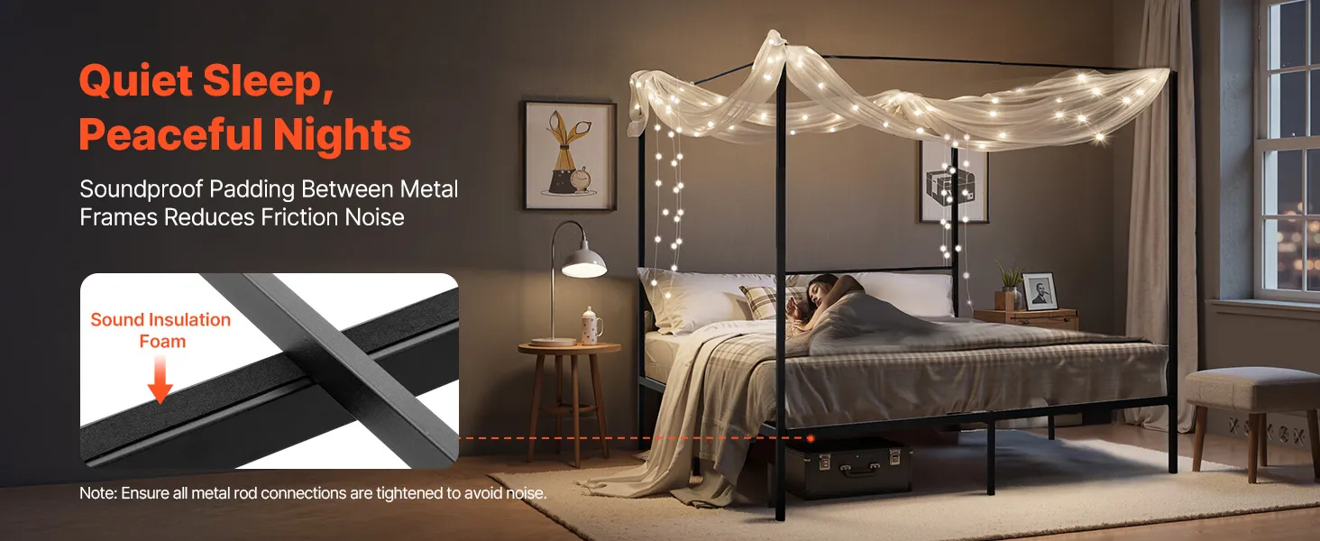 Noise-Free Design: Soundproof padding at metal joints reduces friction noise, ensuring a quiet and comfortable sleeping environment with the black canopy bed