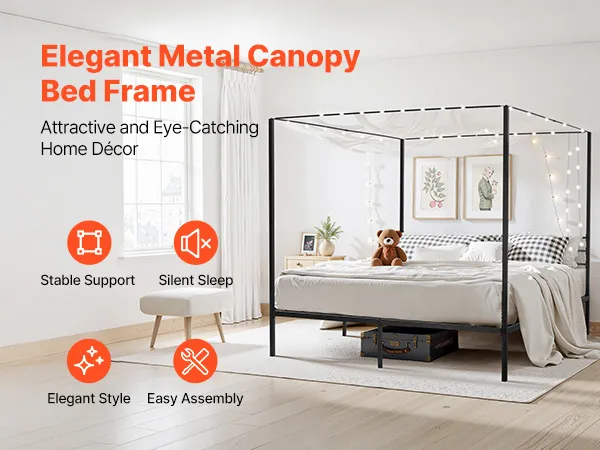 This modern metal canopy bed frame provides both sleek design and practical functionality, featuring 12.4 inches of under-bed storage space for easy organization while adding a touch of elegance to your bedroom.