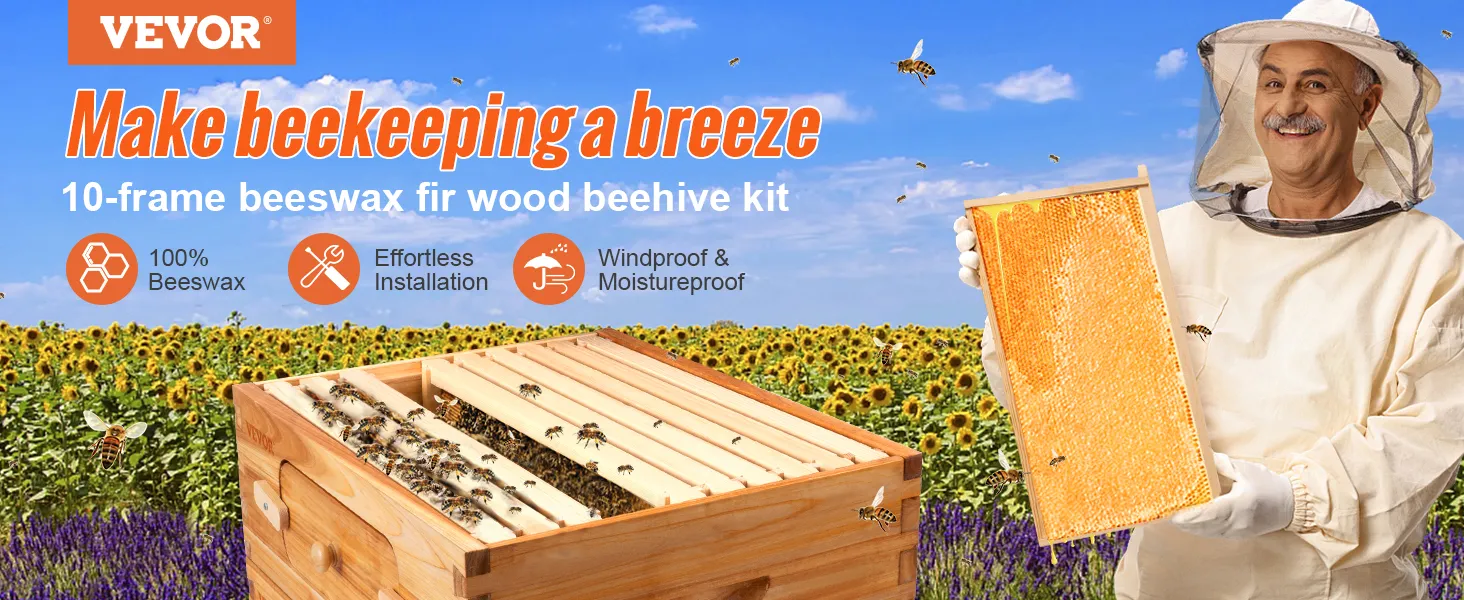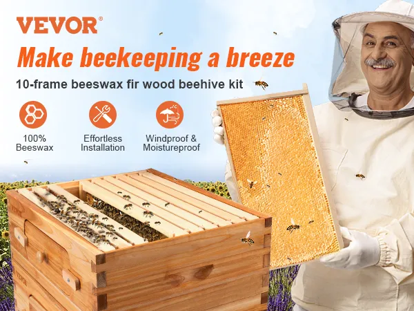 This solid wood beehive is designed for beekeepers, creating a secure home for their bees. The beehive is beautifully crafted from cedar and pine wood. The exterior is moisture-proof and corrosion-proof, and the interior is flexible and breathable. Get ready to enjoy beekeeping with VEVOR!