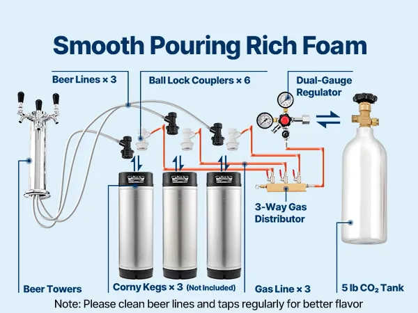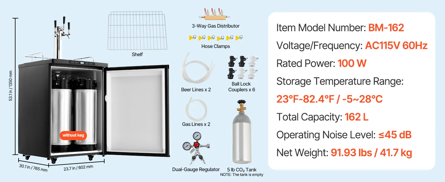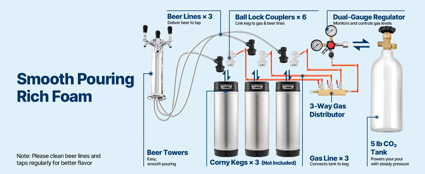 Complete Pro-Level Kit: This kegerator comes with a stainless steel triple-tap beer tower, dual-gauge single-valve regulator, ball lock tap kit, 5 lbs CO₂ tank, and gas lines. All connectors are reinforced to handle frequent use without leaks, ensuring reliable, smooth beer dispensing