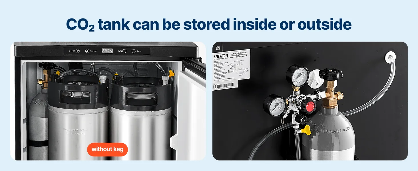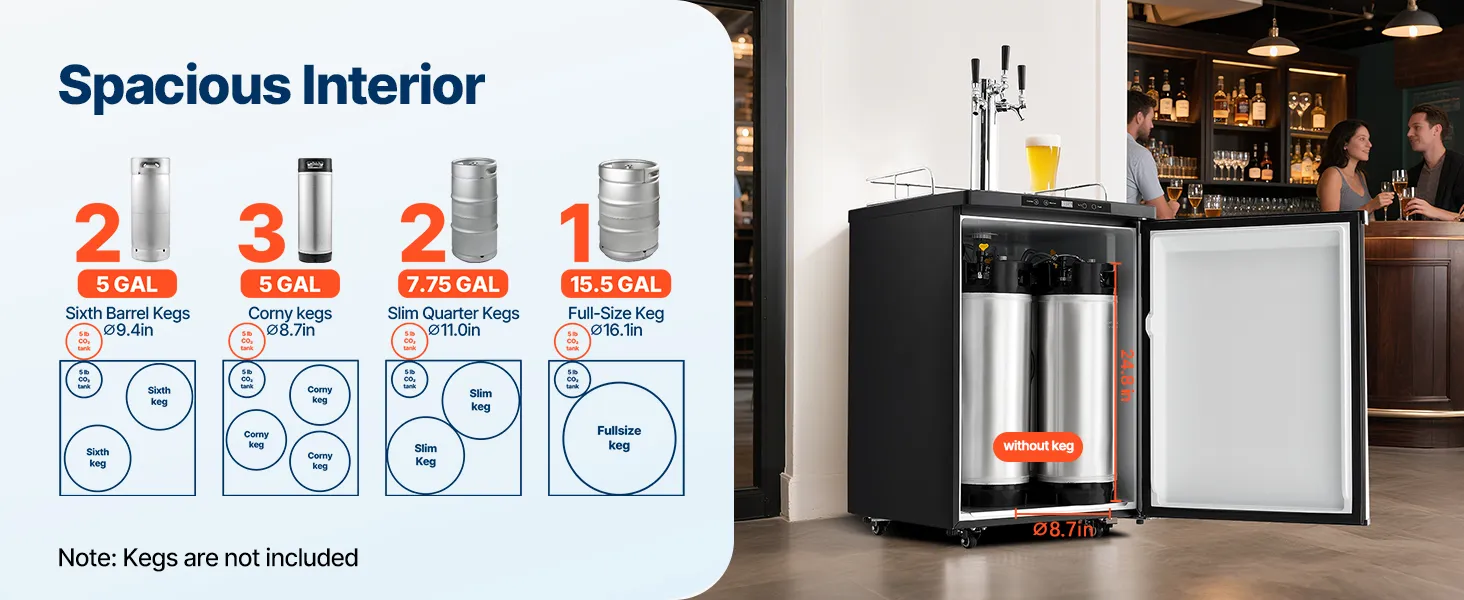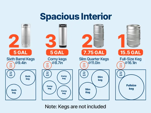 Spacious Interior Design: Our beer kegerator features a flexible layout that accommodates standard keg types: 1 Full Size keg, 2 Sixth kegs, 2 Slim kegs, or 3 Ball Lock kegs, plus a 5 lbs CO₂ tank—all neatly housed for a clean, integrated look
