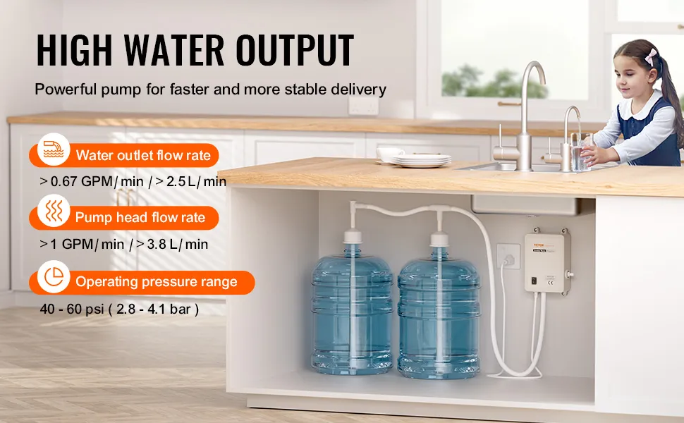 • Superior Performance: This bottled water dispenser pump boasts powerful performance, with a working pressure range of 40-60 PSI (2.8-4.1 bar) and a water outlet flow rate of 0.67GPM (2.5L/min), ensuring quick and stable provision of ample drinking water, meeting your drinking water needs anytime, anywhere.