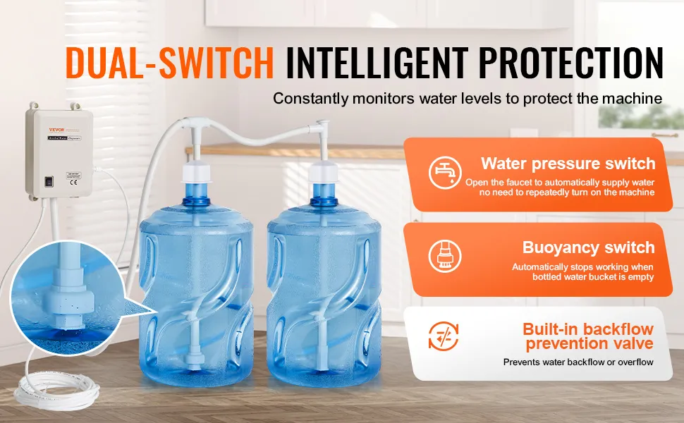 • Dual Switch Protection: Equipped with dual safety protection of buoyancy switch and water pressure switch; the buoyancy switch automatically detects water levels and stops operation when the bottled water is empty; the water pressure switch can realize the automatic water supply by opening the faucet, without repeatedly turning on the machine, effectively ensuring safe usage.