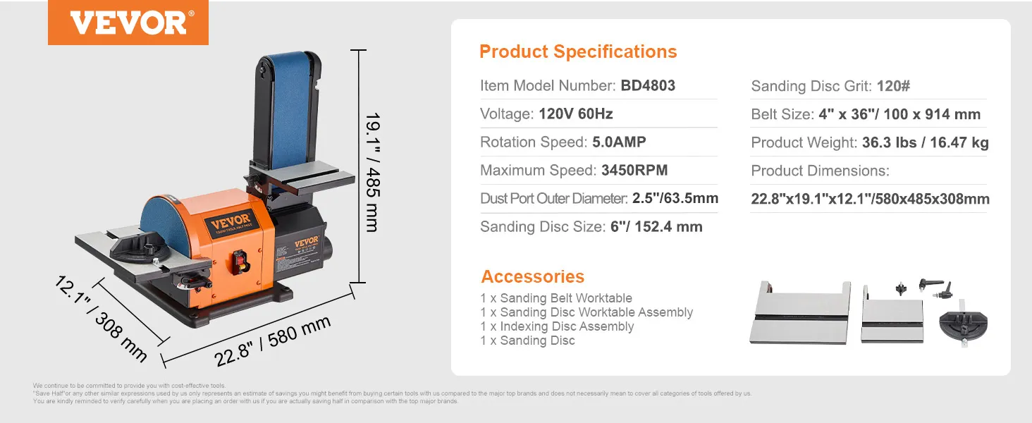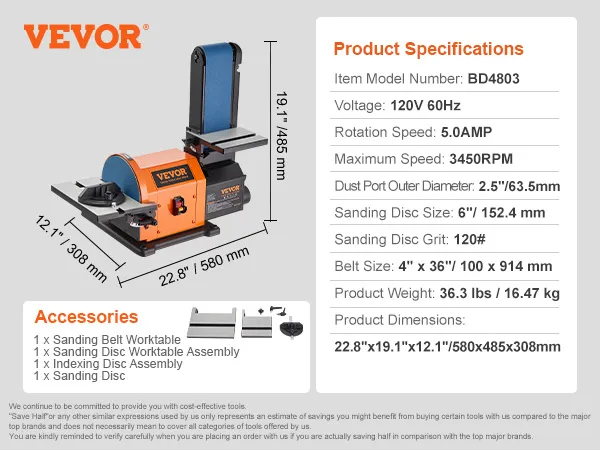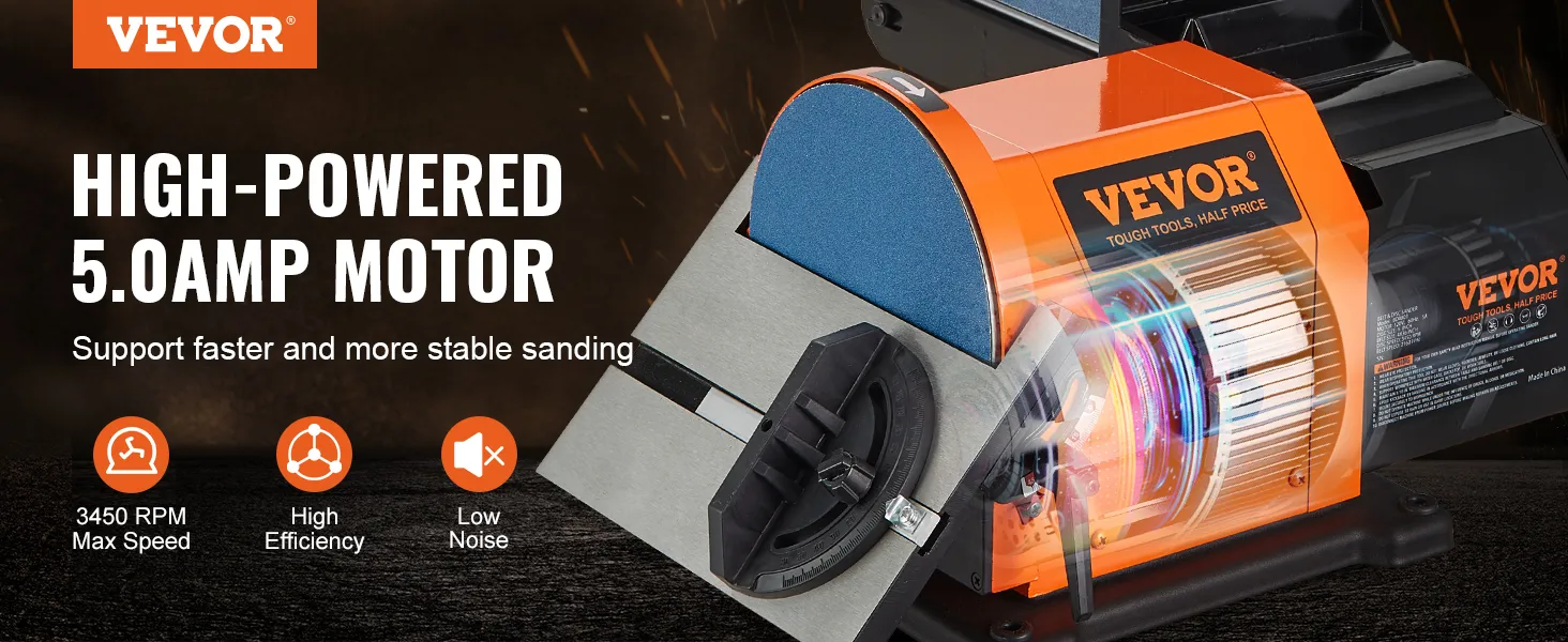 Efficient and Stable Sanding: VEVOR 6" disc sander & 4" x 36" belt sander combo boast a powerful 5AMP fully enclosed induction motor that runs at 3450 rpm (disc speed) and 2160 rpm (belt speed)providing higher sanding power, quieter operation, and greater durability than ordinary motors.