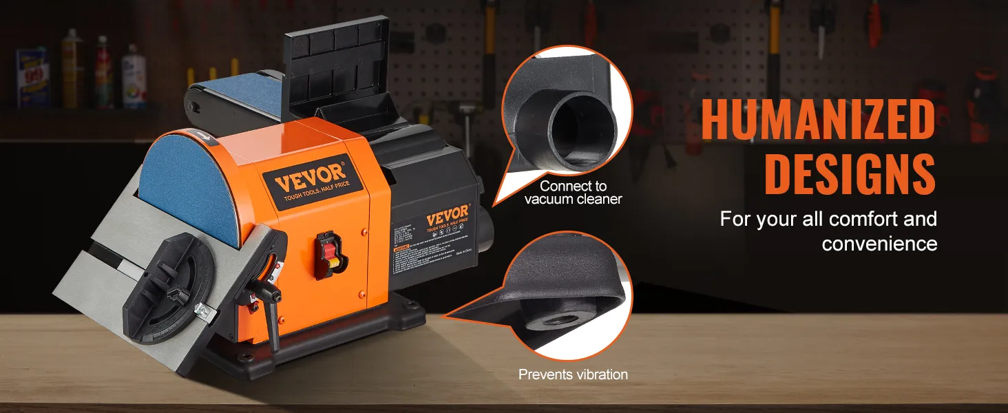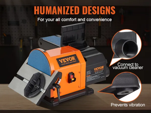 All For Your Convenience: Our belt and disc sander combo is equipped with a steel plate base with non-slip rubber pads for further stabilization. Also comes with a dust collection port that can be connected to a vacuum cleaner for a clean working environment.