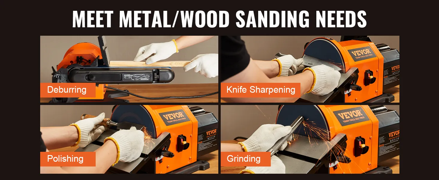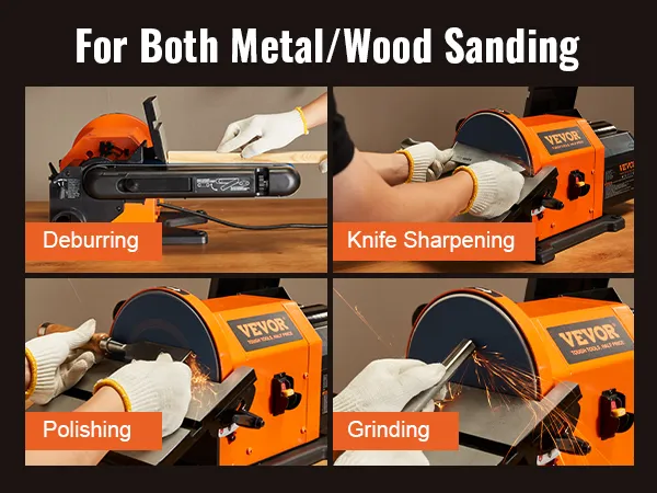 2 in 1 Belt Disc Sander: VEVOR 2-in-1 bench sander combo supports both belt sanding and disc sanding, offering you more options and flexibility. Perform precise sanding and quickly refine your wooden plates and soft aluminum/copper surfaces.